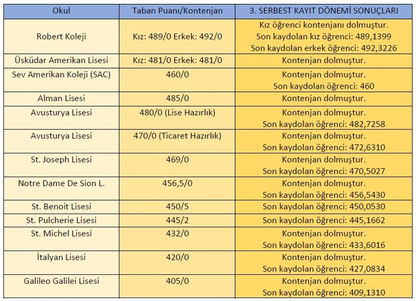 Robert ve Alman lisesi ilk günde kontenjanlarını doldurdu. Üsküdar geçen yıla göre bu yıl daha çok rağbet gördü, bunun en büyük etkisi de St. Joseph Lisesi'ne göre daha uygun bir ücret politikası uygulamış olması. Çarşamba günü doldur boşaltlar olacak, o nedenle istediğiniz okula ilk gün yerleşmediyseniz, ön kayıt yapmayı sakın unutmayın.