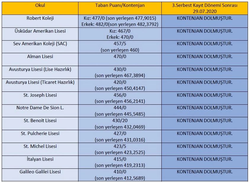 Avusturya hariç tüm okullar kontenjanlarını doldurdu. Avusturya 18 Temmuz itibariyle kayıt almaya devam edecek. Diğer okullar MEB'in nakil tarihlerinde veya sitelerinde açıkladıkları tarihler itibariyle açık oluştuğu takdirde kayıt alabilir.